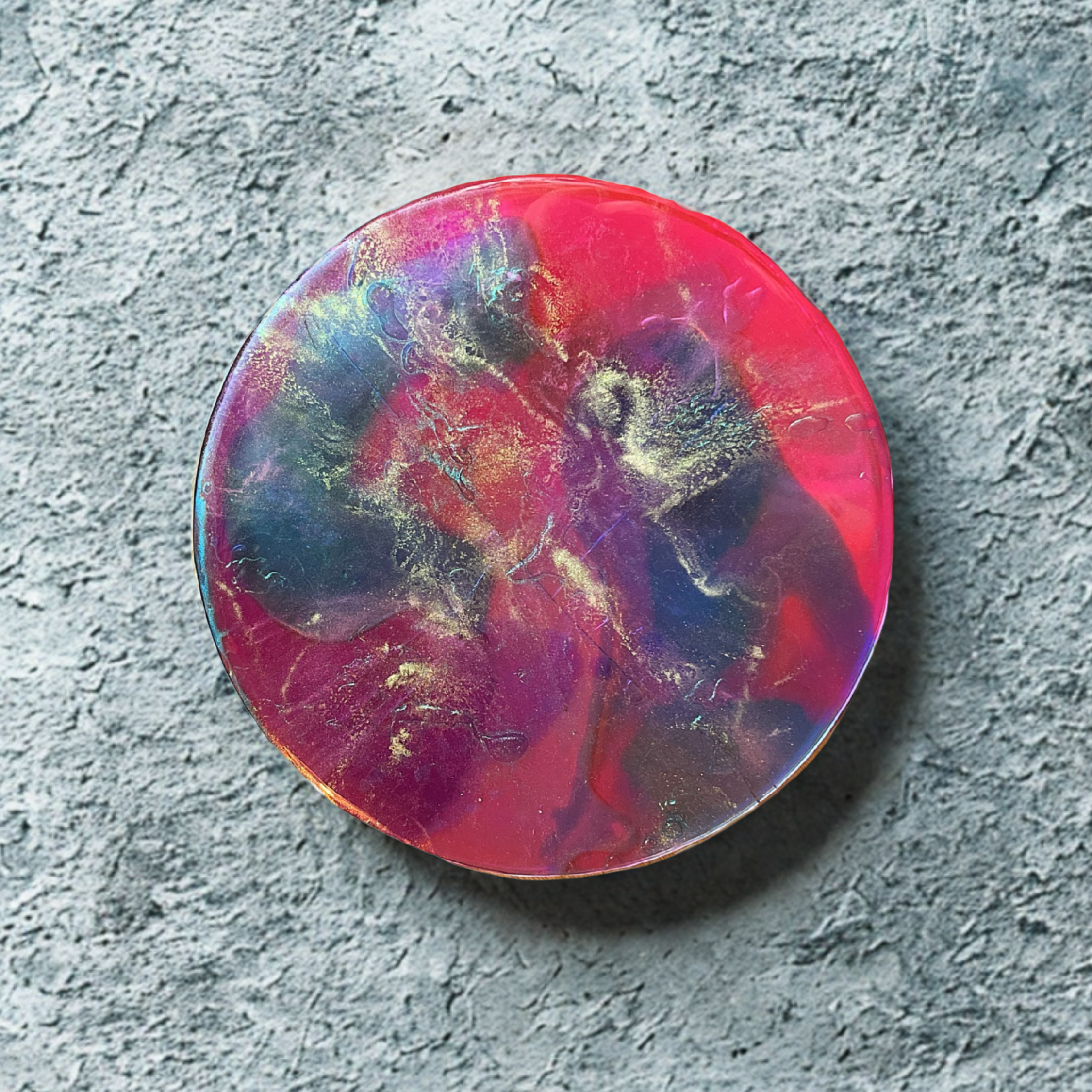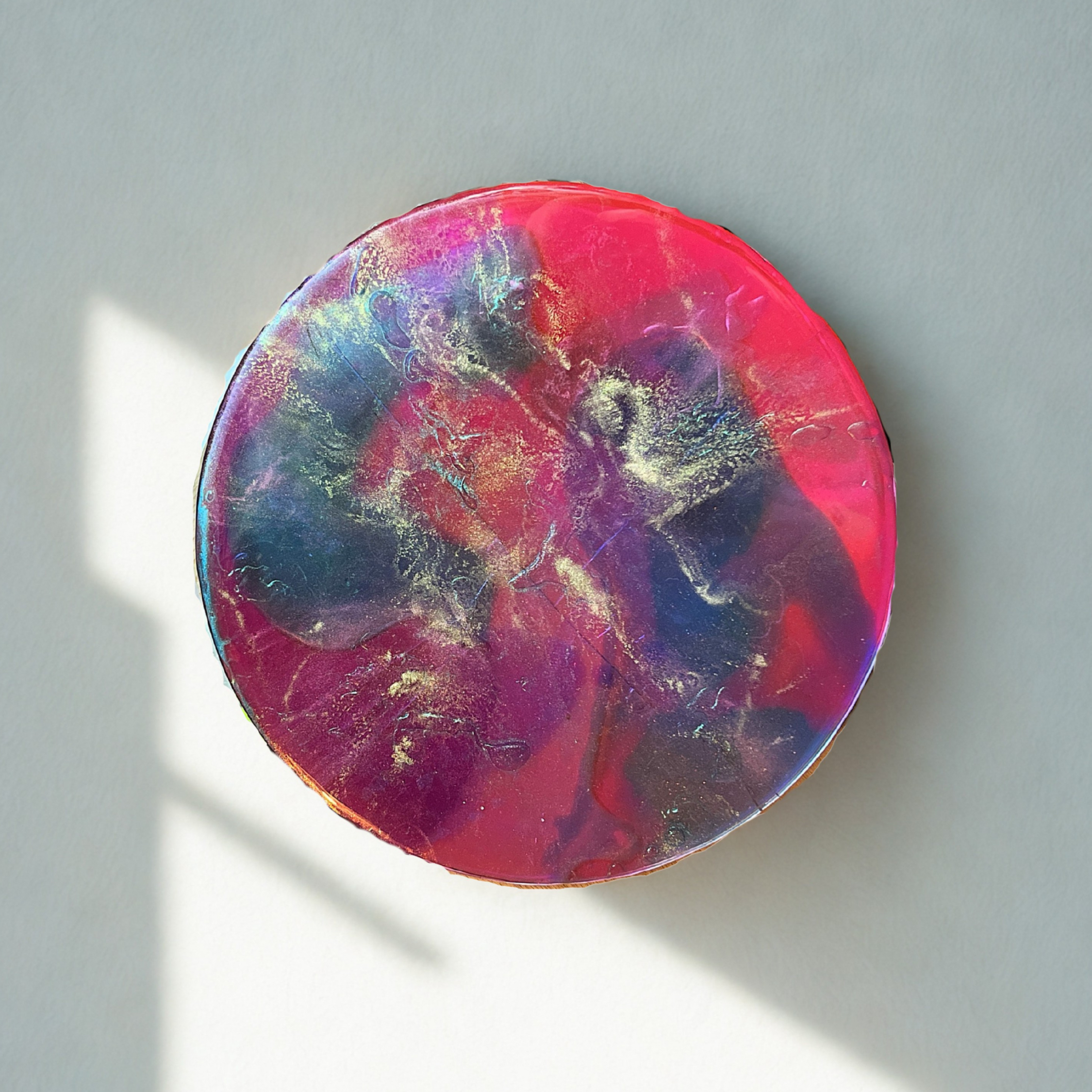 One of a kind, 8″ mirror, Wooden base for wall hanging, Epoxy resin covered art piece.